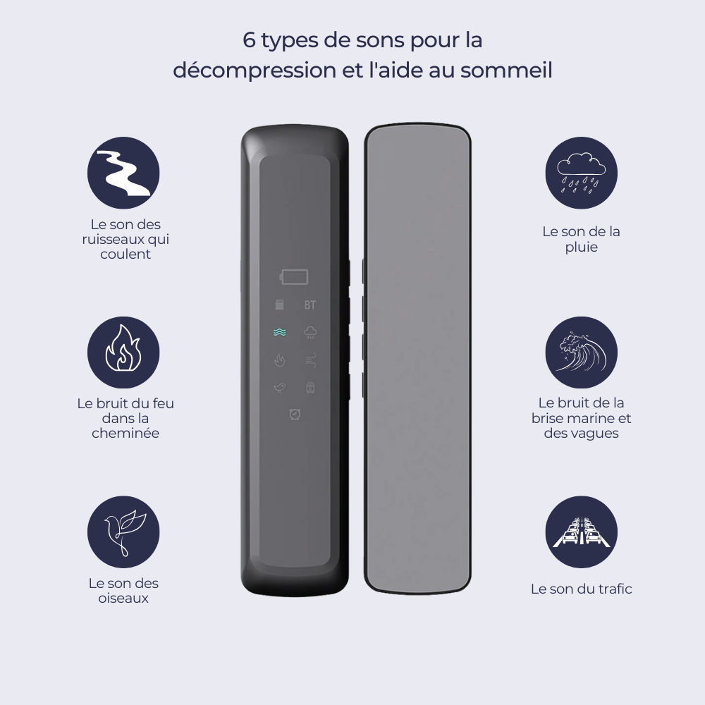 C’est un appareil qui diffuse des sons constants et apaisants (bruit blanc, pluie, vagues, etc.) afin de favoriser la détente, masquer les bruits environnants et améliorer la qualité du sommeil.